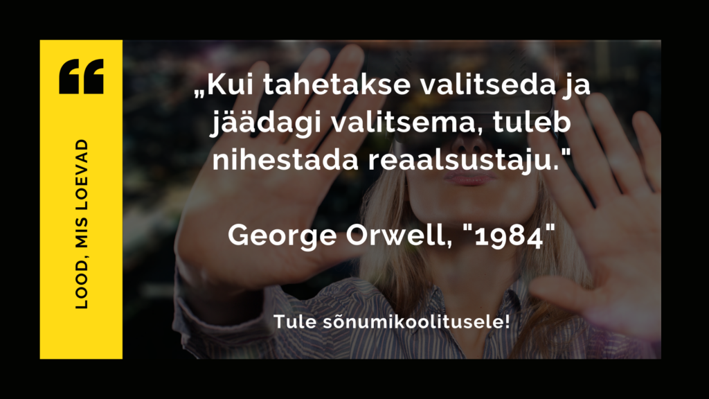 George Orwell kirjutab oma kustumatus teoses „1984“: „Kui tahetakse valitseda ja jäädagi valitsema, tuleb nihestada reaalsustaju. Sest võimul püsimise saladus on oskus ühendada usku oma eksimatusse võimega õppida mineviku vigadest.“ Ja kuigi Orwell kirjutas need read 1940ndate aastate lõpul, ei ole tänini kuigipalju muutunud. Selleks, et juhtida ja valitseda, manitseda ja talitseda, peab looma oma reaalsuse, oma lood ja jutustused, mis on veenvalt veenvad. Me elame lugude maailmas. Me oleme lood ja lood on osa meist. Võidab see, kelle lugu jääb peale ja meelde.